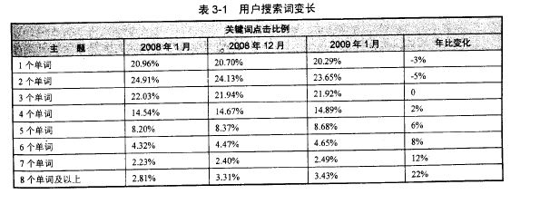 據著(zhù)名市場(chǎng)調研公司 Hitwise 2009年2 月的研究,用戶(hù)實(shí)際使用的搜索詞有越來(lái)越長(cháng)的趨勢,如表 3-1 所示是 2008 年 1 月到2009 年 1 月用戶(hù)搜索關(guān)鍵詞長(cháng)度變化趨勢 。
