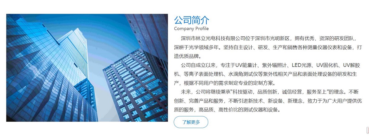 公司自成立以來(lái),專(zhuān)注于UV能量計、紫外輻照計、LED光源、UV固化機、UV解膠機、等離子表面處理機、水滴角測試儀等紫外線(xiàn)相關(guān)產(chǎn)品和表面處理設備的研發(fā)和生產(chǎn),根據不同用戶(hù)的需求制定專(zhuān)業(yè)的定制方案網(wǎng)站建設。