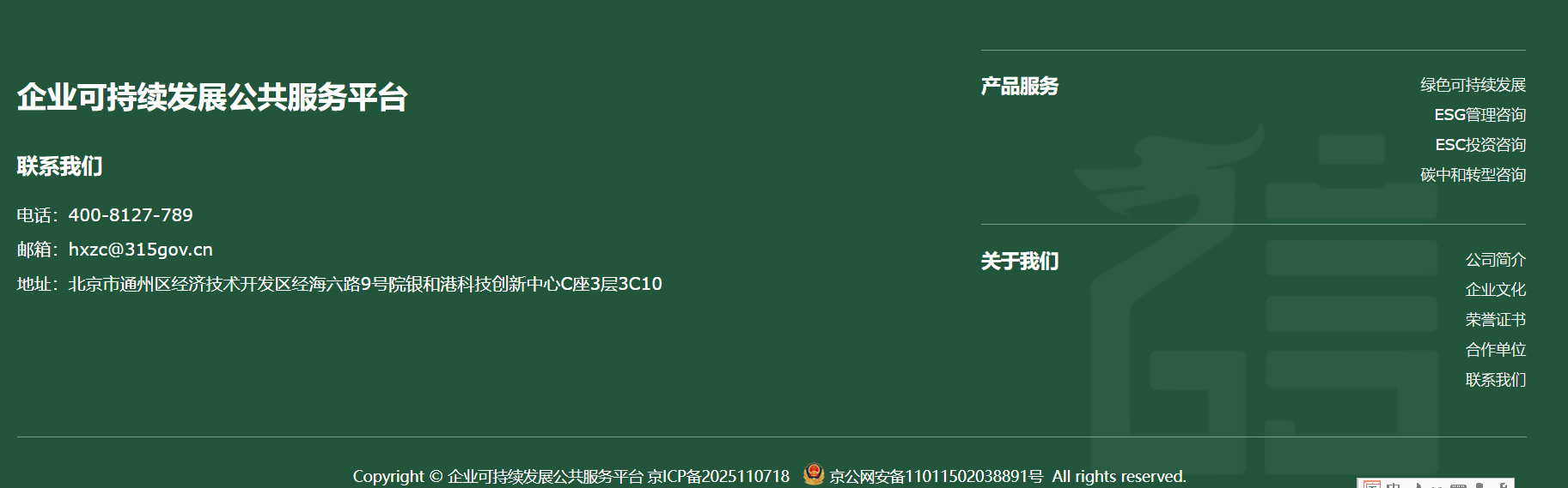 原為華夏眾誠(北京)國際信用評價(jià)有限公司ESG管理咨詢(xún)事業(yè)部。為響應誕生于2020年9月在第75屆聯(lián)合國大會(huì )上提出中國“3060雙碳“目標背景下,作為較早參與國內綠色低碳可持續發(fā)展體系建設的第三方服務(wù)機構,華夏眾誠綠金深耕ESG管理咨詢(xún)、碳中和轉型咨詢(xún)領(lǐng)域,致力于提供專(zhuān)業(yè)、獨立的評估認證與咨詢(xún)服務(wù),是國內專(zhuān)業(yè)可持續發(fā)展數據綜合服務(wù)平臺之一。
